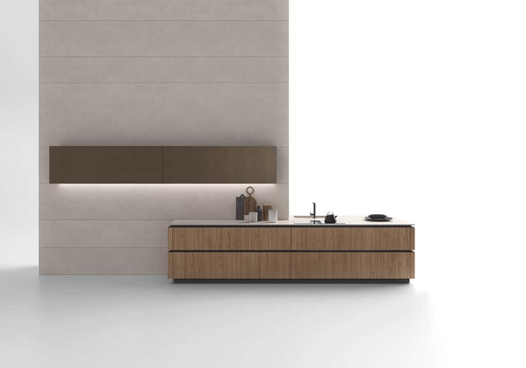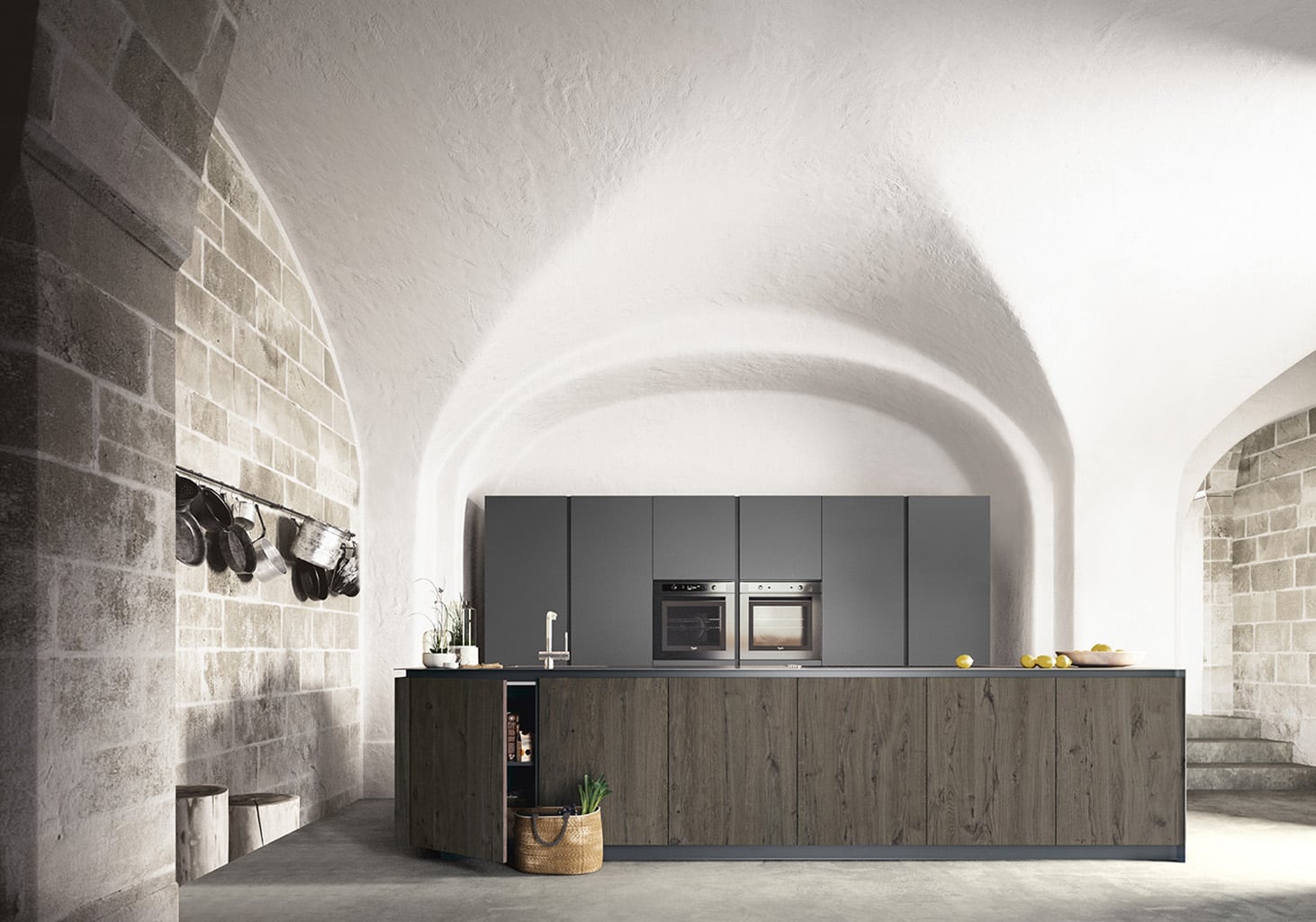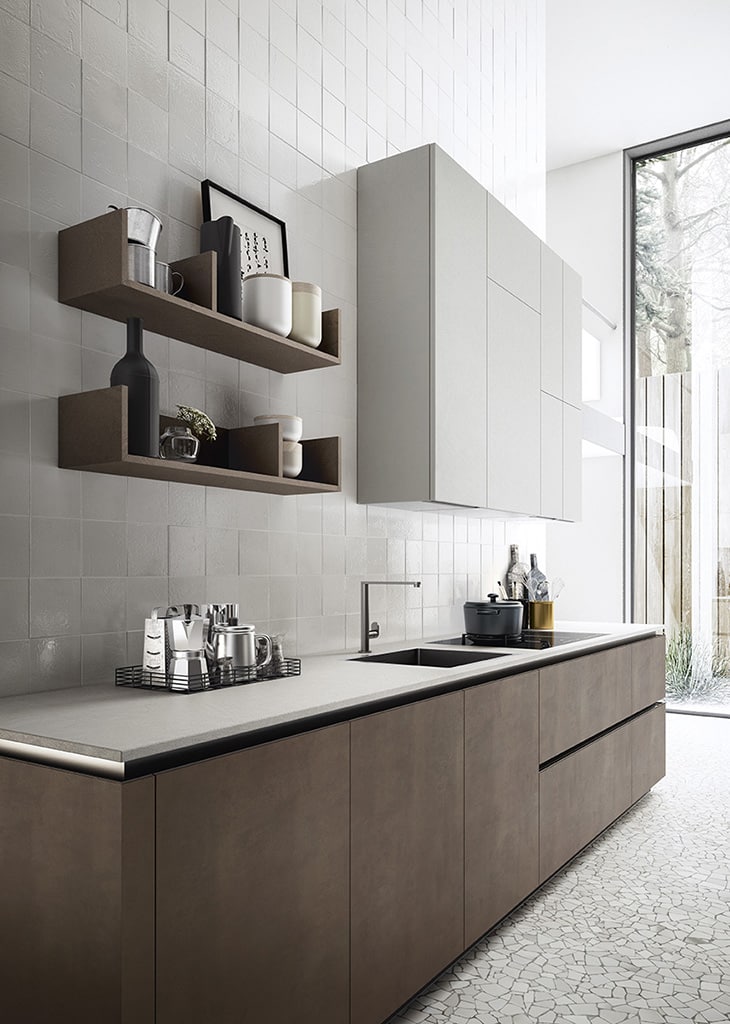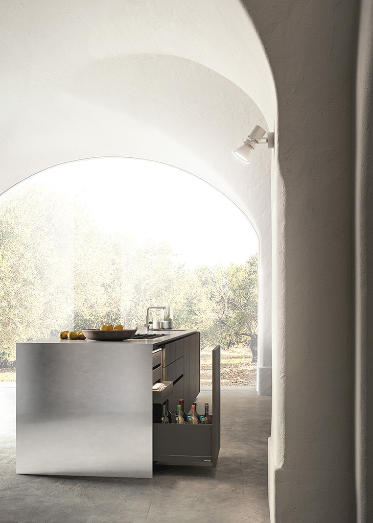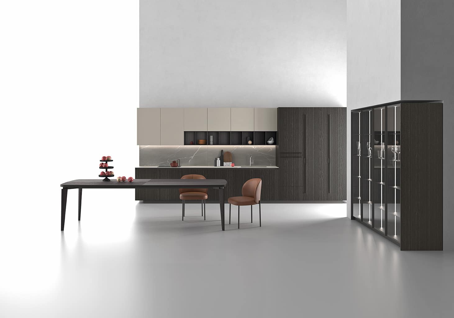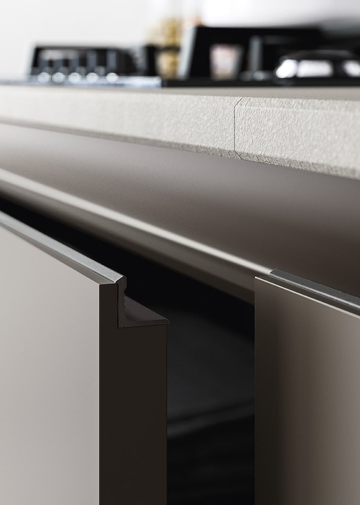 La cuisine Logica est caractérisée par une grande modularité, avec la possibilité de choisir entre trois types d’ouverture avec poignée ou avec gorge et entre trois configurations de profil de porte. Les différentes conformations du profil de la porte, de lisse à incliné, prévoient également la possibilité d’insertion d’un profil métallique qui, combiné avec la structure avec gorge, fournit une aide valable lors de l’ouverture de la porte tout en conservant une esthétique épurée, moderne et sans fioritures.