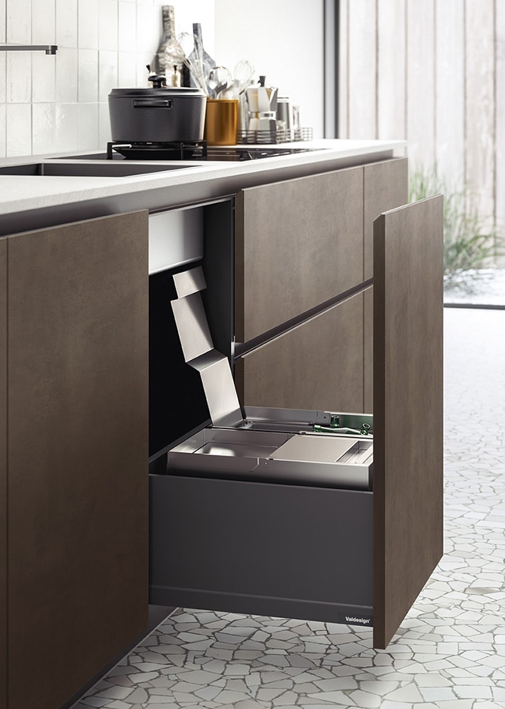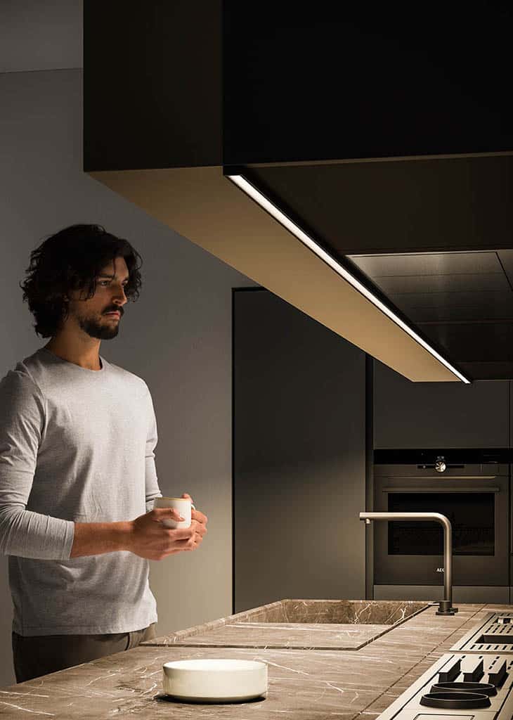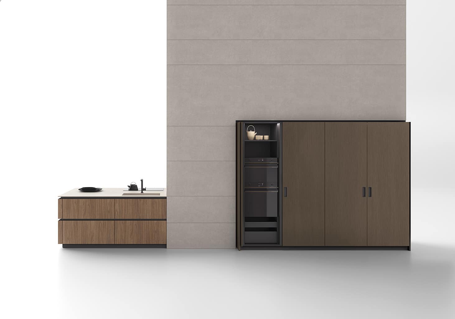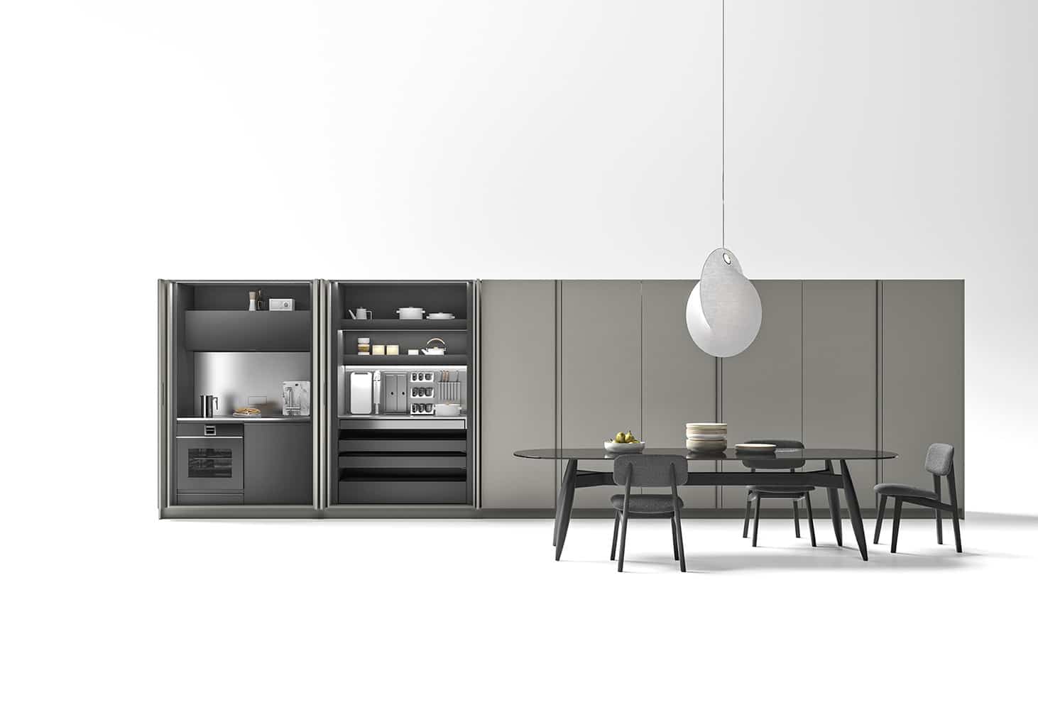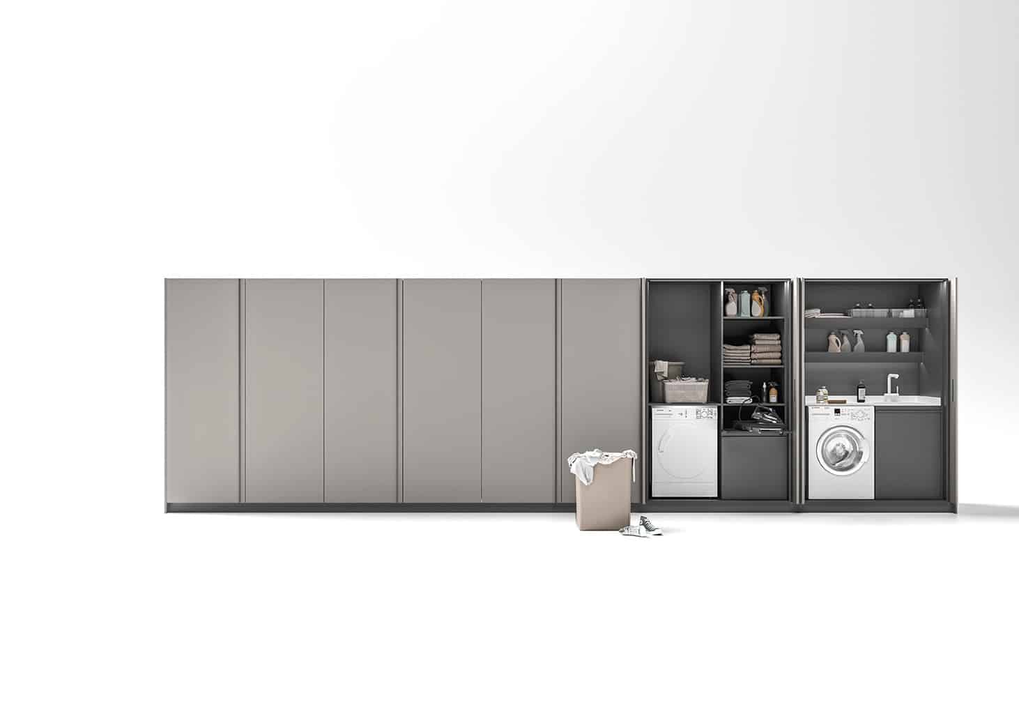La cuisine Logica est caractérisée par une grande modularité, avec la possibilité de choisir entre trois types d’ouverture avec poignée ou avec gorge et entre trois configurations de profil de porte. Les différentes conformations du profil de la porte, de lisse à incliné, prévoient également la possibilité d’insertion d’un profil métallique qui, combiné avec la structure avec gorge, fournit une aide valable lors de l’ouverture de la porte tout en conservant une esthétique épurée, moderne et sans fioritures.