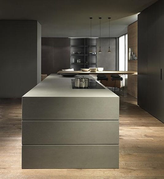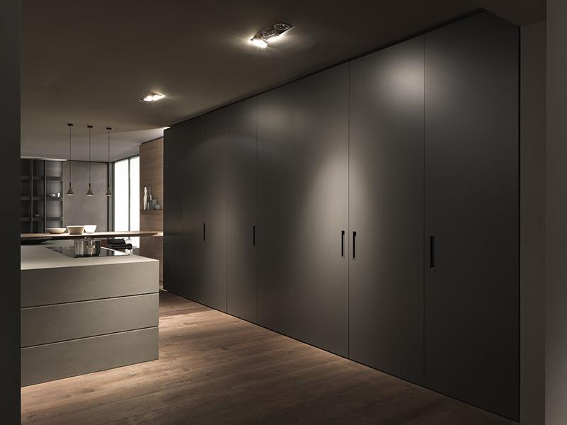 Avec ses très grandes portes rentrantes de H.270 cm en aluminium alvéolaire laqué mat Dark Depth et leur poignée assortie, le plan de travail avec l’évier intégré et la crédence assortie en céramique Grey Calm sont fermés lorsque cette partie de l’espace cuisine n’est pas utilisée.