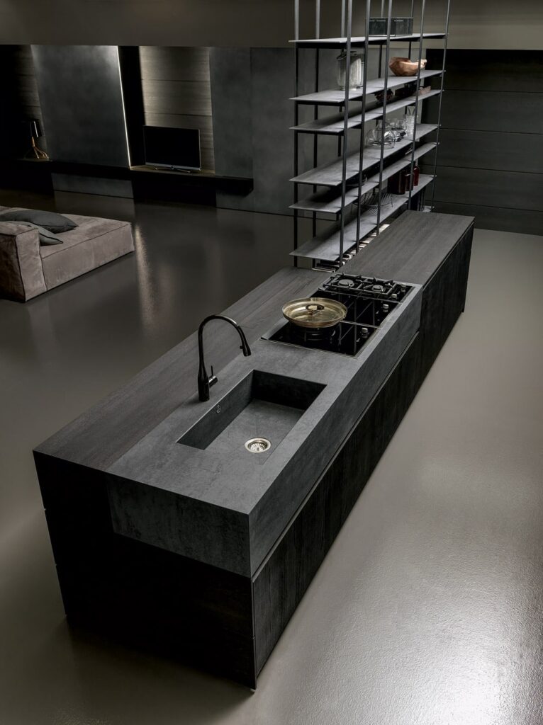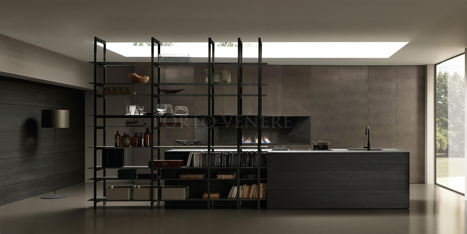 Portes de 1cm d’épaisseur et plan de 1,2cm réalisé avec coupe d’onglet à 45° en chêne fumé avec espace postérieur prévu pour y intégrer une bibliothèque. Insert sur plan de travail réalisé avec une pièce monobloc en céramique Pietra di Savoia Anthracite, comprenant l’évier intégré et plan de cuisson à induction en verre et inox. L’utilisation du dosseret avec coupe à onglet à 45°, qui crée une ligne pure et simple, l’absence de poignée, de plinthe, les grandes hauteurs jusqu’au plafond des portes coplanaires dans lesquelles tout est disparaît font de cette cuisine Blade une véritable œuvre d’art.