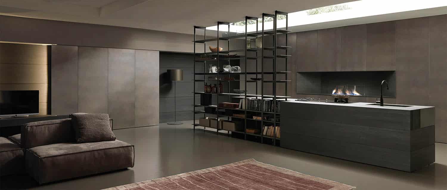 Cuisine caractérisée par de grandes portes en aluminium alvéolaire de 1 cm d’épaisseur, proposées ici en finition laque métallisée, bois et céramique. Meubles de séjour et bibliothèque de séparation assortis.